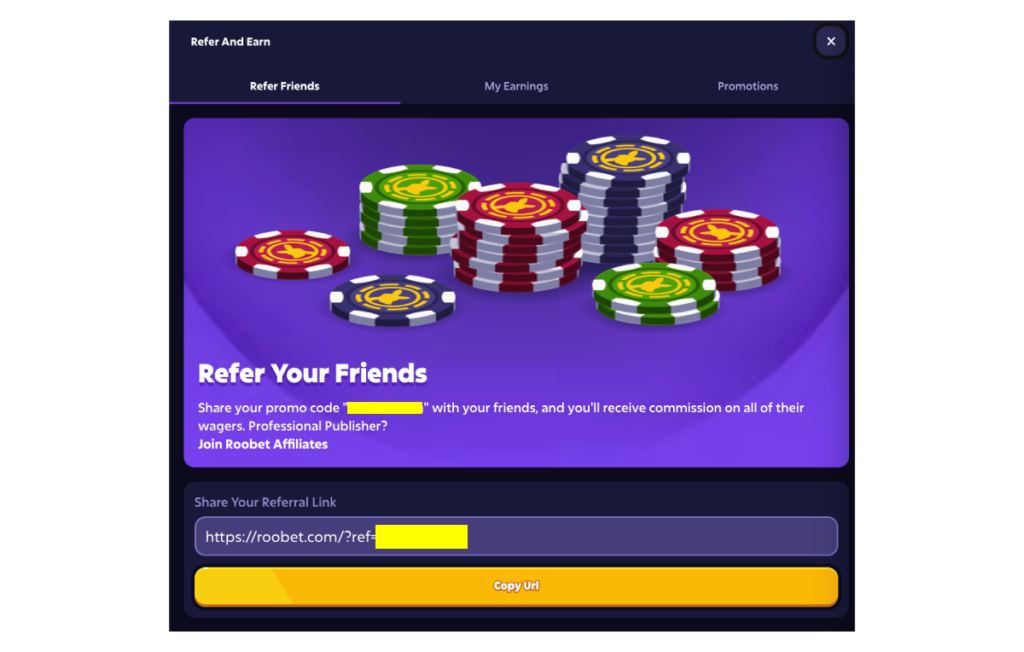 Below is a quick guide to Roobet’s Refer and Earn program. It covers how to navigate the dashboard and how other people should use your referral codes to benefit from this programme.