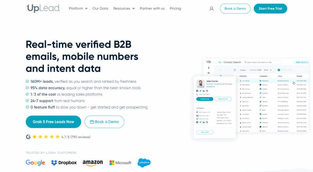 UpLead is a B2B database and prospecting tool that offers a 95% data accuracy guarantee. It provides access to over 160 million contacts, which can be filtered using more than 50 criteria to build highly targeted lead lists. Other features include real-time email verification and intent data to help sales teams identify customers who are actively looking for solutions.