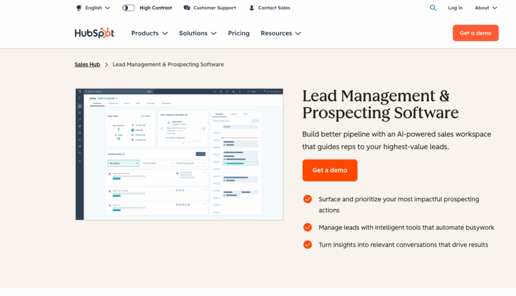 HubSpot offers an AI-powered sales platform that integrates lead management and prospecting directly into its CRM, creating a unified system for sales teams. The AI-driven workspace helps sales representatives focus on the most valuable leads, resulting in more acquisitions and more closed deals.