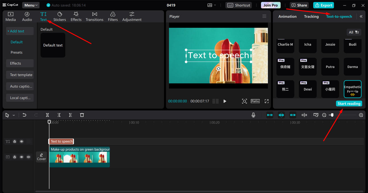 Write your script by clicking on the Text > Add text button. Then, click on your text and use a text-to-speech tool. Pick a voice you like. You can even change the speed or tone of the voice.